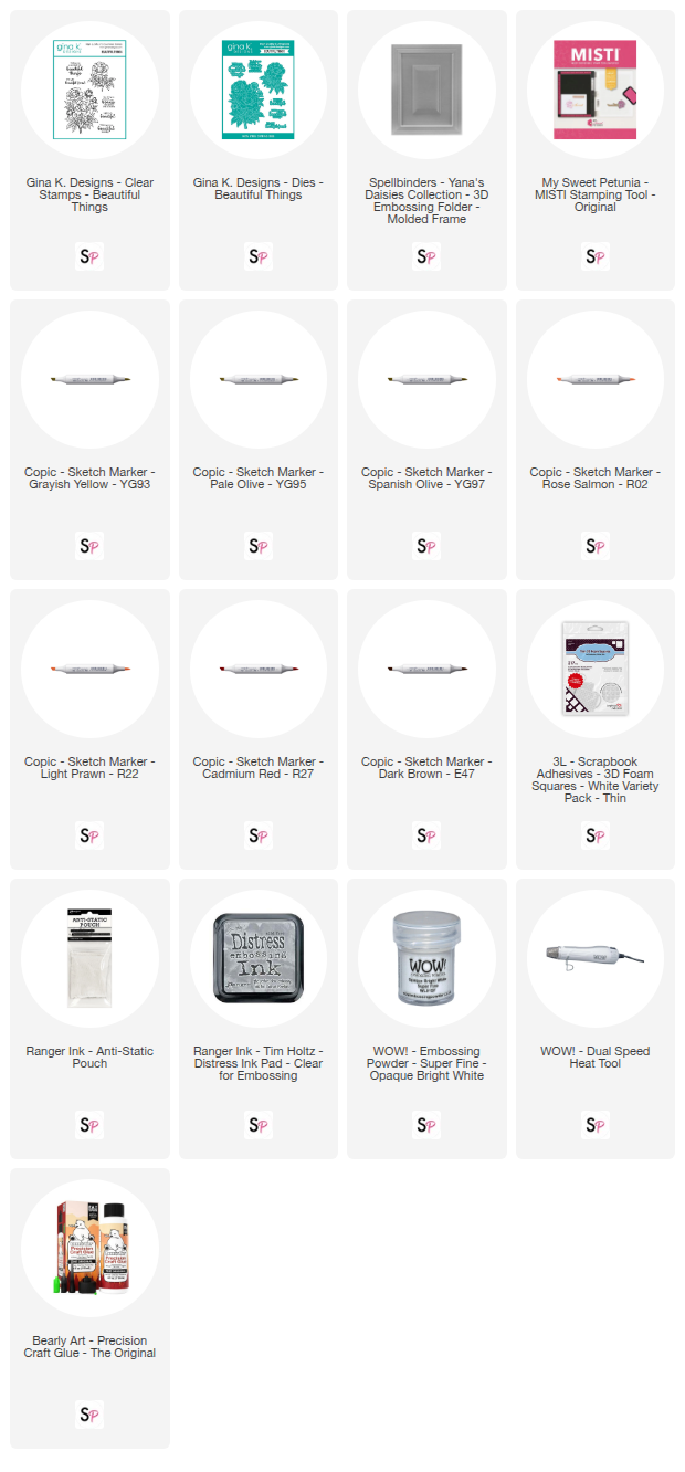 For the first stamped image, I colored the leaves and stems using Copic Sketch Markers YG93, YG95, and YG97 and applied a blanket coat of R02 to all the flowers and buds (no shading). On the second stamped image, I colored the flowers and the leaves attached to each flower head using Copic Sketch Markers R02, R22, and R27. After completing the coloring, I used the coordinating die from the Gina K. Designs Beautiful Things Die Set and die cut the colored image that had the leaves colored in and die cut two more pieces from plain white cardstock with the same die to adhere behind the colored die cut for dimension. Next, I fussy cut the flowers from second image and added a single layer of Scrapbook Adhesives Thin 3D Foam Squares behind the flower buds and the open flower at the top of the image and added two layers of the foam squares behind the large, central flower.